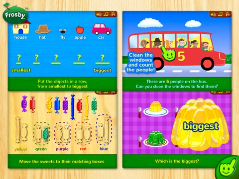 - Learn ‘biggest, smallest, shortest, tallest, and longest with fun, animated games with unique sounds.