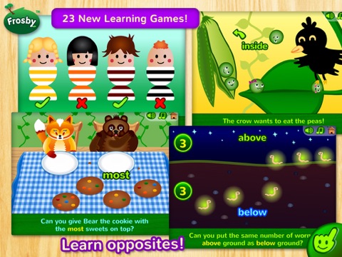 The Frosby characters return in the fun-filled second collection of the hit preschool app Frosby Learning Games! This app focuses on shapes, opposites, matching and fine manipulation skills for ages 2-5.