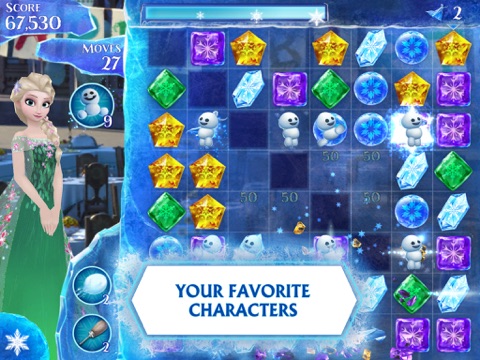 UNIQUE POWER-UPS SPECIALLY DESIGNED FOR EACH CHARACTER – Use Anna’s torch to burn up an entire row of crystals, or Elsa’s glacier power-up to make all of the same color crystals magically disappear! Try Hans’ sword to slash right through the crystals, and explore many more cool power-ups!