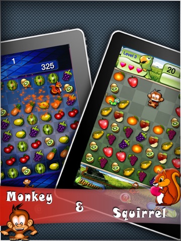 - Animated squirrels clears all fruits in a row or column, if you excite them with a nice combo of fruits adjacent to them
