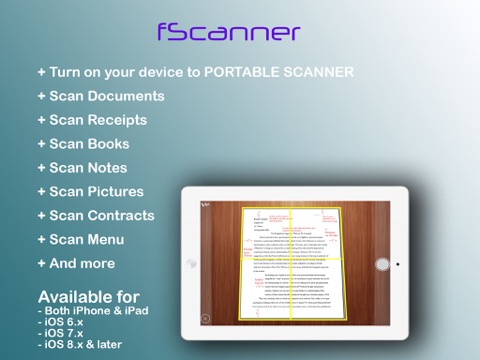 fScanner help you scan your documents, books, receipts... and save it to PDFs or Photo libs