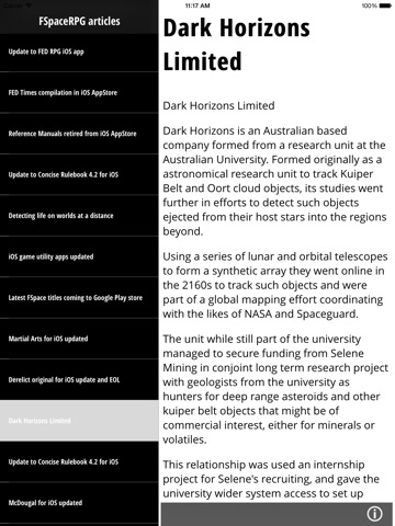 A simple RSS listing of the FSpaceRPG.com RSS feed and linkages to view applicable article page in Safari on the iPhone. Helps you keep in touch with the latest roleplaying game news for science fiction games FSpaceRPG and FED RPG, as well as the fantasy game TayanaRPG.