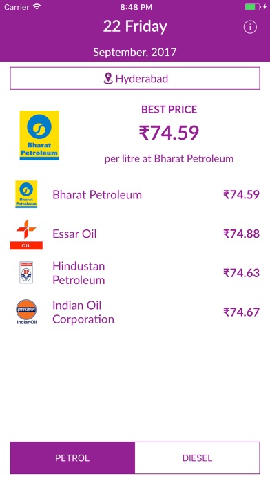 As the name says this app give you insight on Today Fuel price with BEST PRICE defined up front at Top. We provide pricing details from the major fuel vendor around the city.