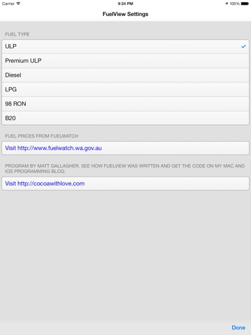 FuelView uses the GPS in your iPhone (or a manually entered suburb name or postcode) to fetch petrol, diesel or LPG prices near you. Results are labelled with their distance from your location and tapping any row displays the result and all surrounding results on a map. From the map you can also open the result in the Maps app for directions.