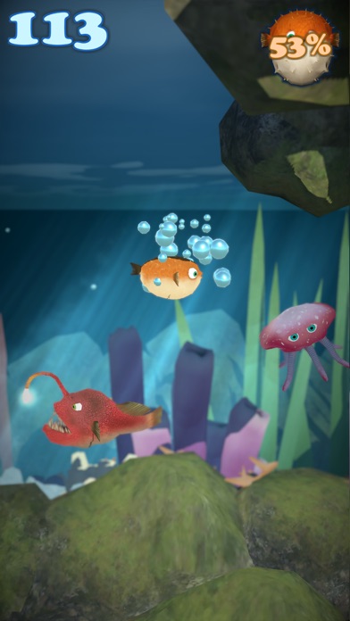 As you progress Fugu will inflate making him more buoyant and more of a challenge to control however when he collides with a bubble Fugu expels air decreasing his size allowing for better control and a higher potential score.