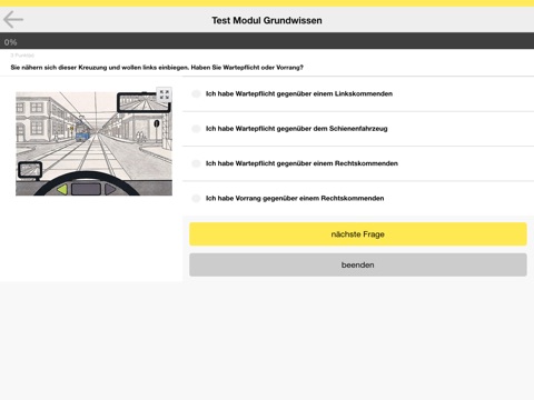 + Bei einer Frage können eine bis alle Antworten richtig sein. Eine Frage wird als richtig beantwortet, wenn alle richtigen Fragen auch als solche markiert wurden. Die Fragen bestehen aus Haupt- und Unterfragen, Hauptfragen werden immer gestellt. Unterfragen werden nur gestellt, wenn die Hauptfrage richtig beantwortet wurde – ganz wie bei der Theorieprüfung.