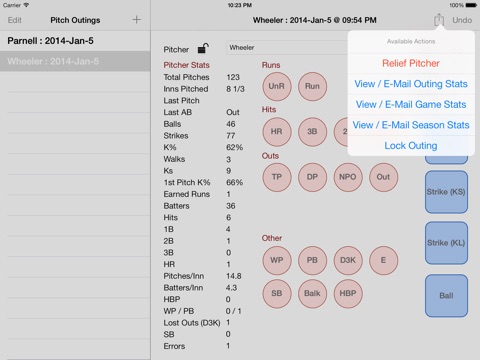 Pitch Counter supports the relief pitcher concept to ensure accurate on screen representation of game state and completeness of game level statistics. Once a relief pitcher enters the game, the prior pitchers information remains available. Simply navigate back to the Pitch Outing view and select the outing of interest. Undo works across relief pitchers. Once the first event of a relief pitcher is erased, the relief pitchers associated Pitch Outing is erased.