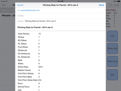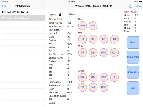 The interface is designed to minimize touches. In most cases, a pitch requires a single touch. There are a few instances that require two touches to ensure all statistics are accurate. When an event is captured in error, there is an Undo button to return Pitch Counter to its previous state. Behind the scenes Pitch Counter records all events, so Undo can be used to erase an entire outing, please use with caution.