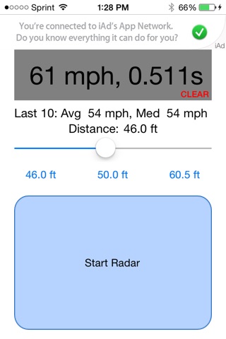 Sports Radar is an iPhone / iPod targeted application designed to capture the speed of a moving sports object. The application retains a history of previous speed readings and displays both the average and median values of the historical readings.