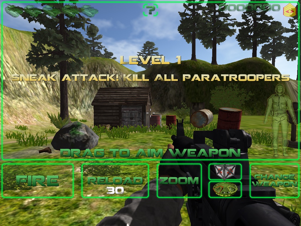 Armed with a standard issue M4, land mines, Grenade Launcher and optionally the powerful AT4 Anti-Tank rocket launcher, M60 and Sniper rifle. Stop the invasion and rise in the ranks all the way to 4 star general.