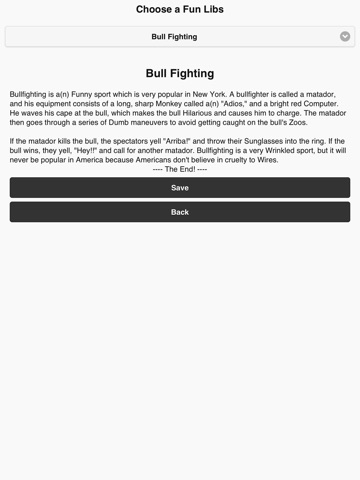 Fun Libs is an ad-libs (adlibs) game similar to the classic "Mad Libs" game (MadLibs), however in this version you cannot see the text surrounding the inserted words, which means the the final result is even funnier and more unpredictable!