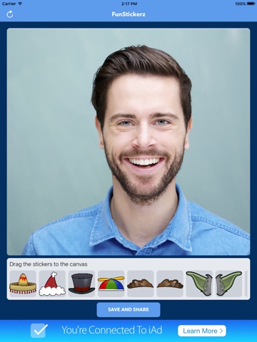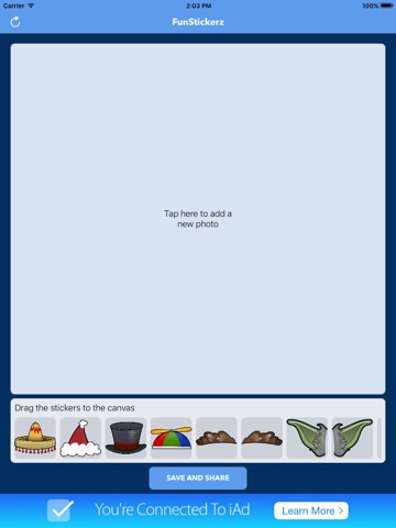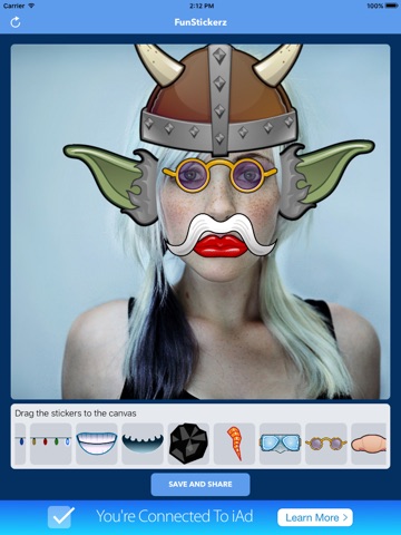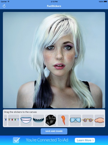 Take photos with the cam or use those in your archive and decorate them with funny stickers. There are now more than 120 stickers to choose. Position and adjust your picture per drag and zoom with two fingers. Then choose your stickers and drag them on the canvas where you can zoom and rotate them to fit. If you are satisfied with the result, save, share and send your funny creation to the world.