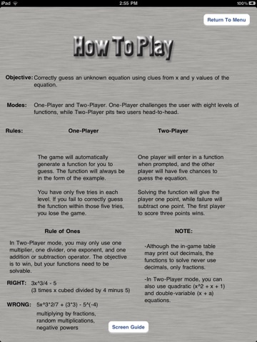 This game supports algebra functions ranging from simple "x + 5" equations to ones such as quadratics and "x+a" for two-player. Function Mystery Machine is recommended for middle school students enrolled in algebra classes and above.