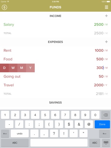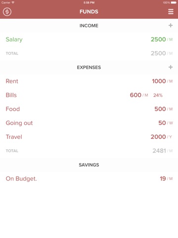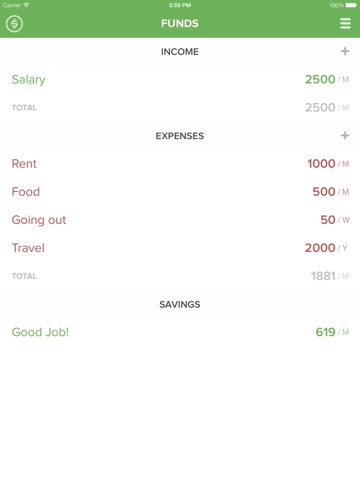 Creating a budget should be easy and fun. Funds helps you create a budget by simplifying the process and eliminating complicated steps. Simply add your income and expenses including the amount and frequency (daily, weekly, monthly, yearly) for each item and Funds will calculate and visualize how much youre spending and saving. The color scheme will also change based on how much youre saving to give you a quick impression of your savings throughout the app.