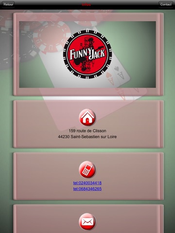 Lapplication "Funny Jack" vous offre la possibilité de consulter toutes les infos utiles du bar (Tarifs, prestations, avis…) mais aussi de recevoir leurs dernières News ou Flyers sous forme de notifications Push.