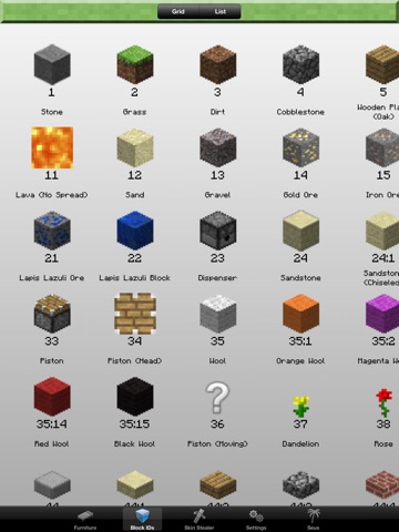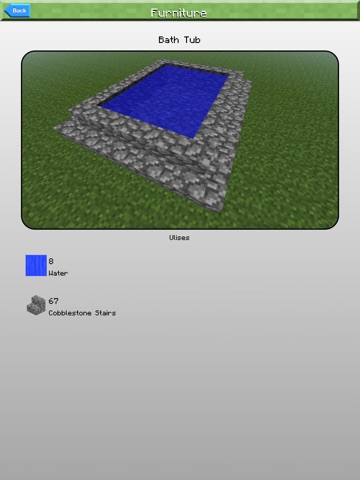This app has furniture setups to help with creating furniture inside of Minecraft. Each setup has a picture and a list of materials needed. Look at pictures below for examples. Also included is a searchable block IDs list for version 1.4.6.