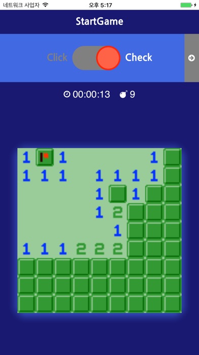상단에 토글 버튼으로 한번 터치로 지역을 개방하거나 지뢰를 체크할수있습니다.