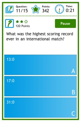 Das spiel ist echt super und sogar ich als Fußballjunkie habe meist 2-3 Fragen von 15 falsch beantwortet. Jedoch stört mich, dass bei manchen Fragen eigentlich auch 2 Antworten möglich wären, eine davon aber als falsch gewertet wird. So ist zB. bei der Frage nach dem Ergebnis des Endspiels der WM 2006 nicht nur 5:3, sondern auch 1:1 richtig, denn offiziell werden im Elfmeterschießen entschiedene Spiele für zB. die 5-Jahres-Wertung mit dem Ergebnis nach 120 Minuten gewertet. Eine andere Frage war, wer für den Austausch eines Balles sorgen kann. Hier ist nicht nur die Lösung "Der Schiedsrichter" richtig, sondern auch der Torwart. Denn vor dem Spiel werden die Torhüter gefragt, ob der Ball ok ist, wenn einer der beiden verneint muss ein neuer Ball besorgt werden. Deshalb nur 4 Sterne, aber im Grunde eine super App!