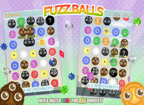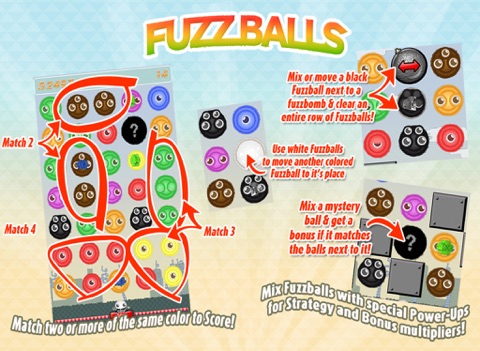 The Fuzzballs are here in an all new game with 100 levels of mix and matching! If youre a fan of casual match 3 games then youll love this completely new & original type of mix and match game play! Theres nothing quite like it! The ability to mix colors and create massive cascading Fuzzball avalanches is fun for all ages! Plus, these little Fuzzballs are super cute and they really want someone to play with them! Download Fuzzballs to see what all the fuzz is about!
