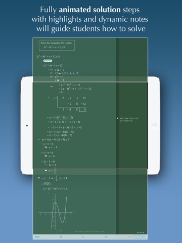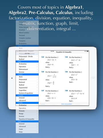 - For user typed-in problems, this app provides both static and dynamic(-animated) form of answers and solutions, so students can easily follow the problem solving steps applied in the derivation of answer.