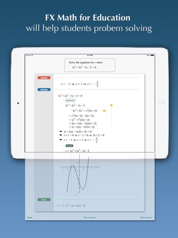 FX Math for Education is a math tutoring and assistant tool for middle-, high-school, and undergraduate level students, and distinguished from other math apps, in the following aspect: