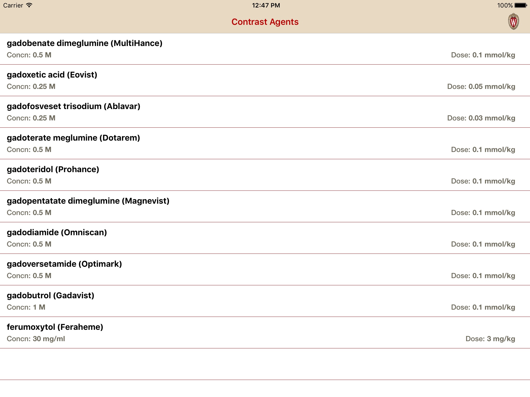 • Look up standard, and University of Wisconsin specific, doses for all FDA approved contrast agents