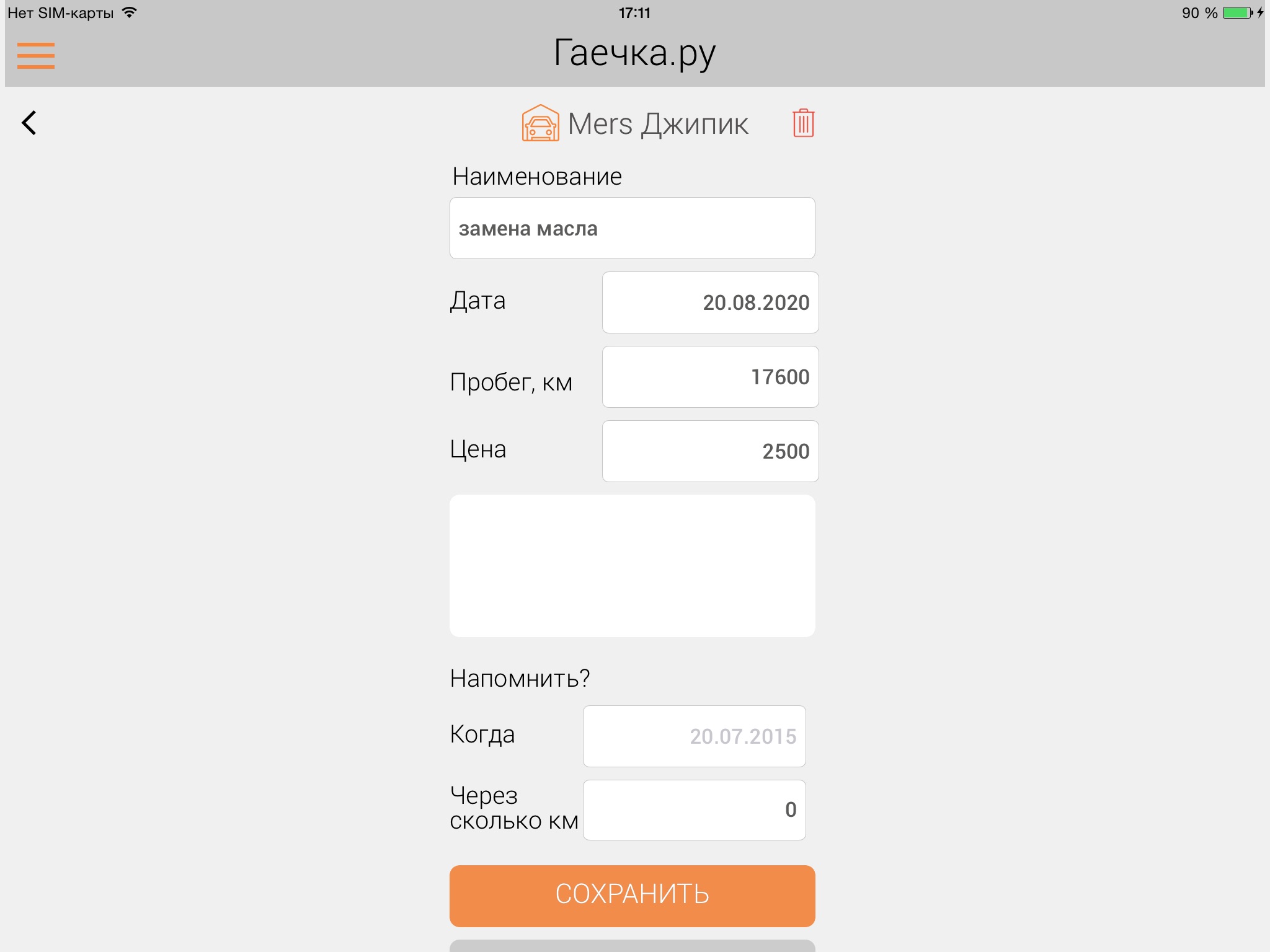 С помощью Гаечки вы не пропустите очередную замену масла, колодок, фильтров, продление страховки (ОСАГО, КАСКО) или любое другое событие! Гаечка напомнит вам в нужную дату или через заданное количество километров пробега.