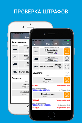 - ШТРАФЫ (Проверка по водительскому удостоверению и номеру свидетельства о регистрации ТС и оплата) – доступно при обновлении