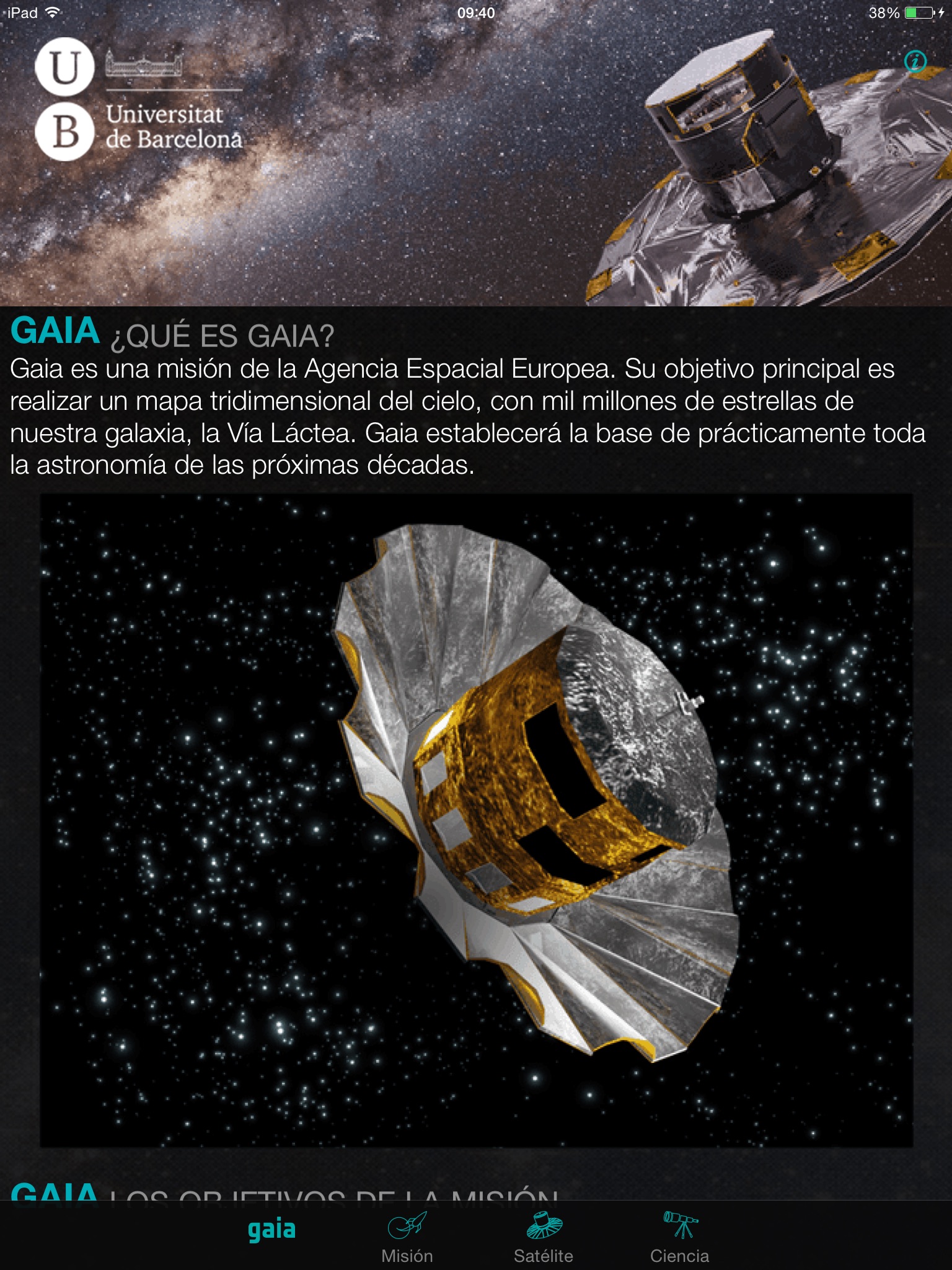 Gaia allows you to discover the details of Gaia, the cornerstone astrometry mission of the European Space Agency (ESA) to survey our Galaxy. The main goal of the Gaia mission is to make the largest, most precise three-dimensional map of our Galaxy by surveying an unprecedented one per cent of its population of 100 billion stars.