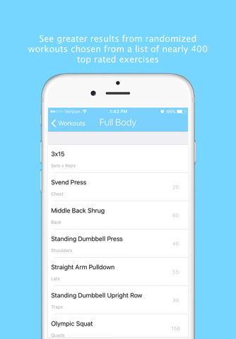 Randomized exercises for each kind of workout from a database of over 300 exercises that have been rated the best exercises for each muscle group.
