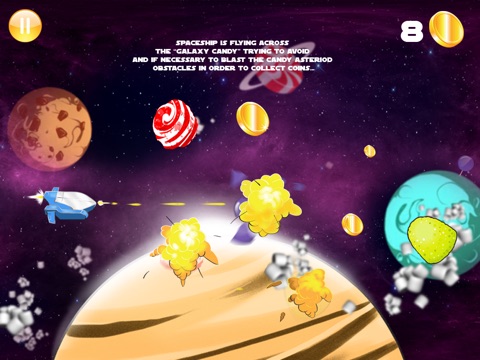 How long can you stay alive? How many coins can you collect? Take control of your spaceship and blast through the candy asteroids hurtling through space!
