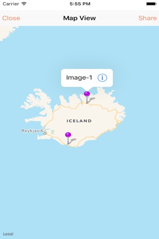 You can then select a given pin on the map to see a specific picture AND you can also share the selected map to your friends