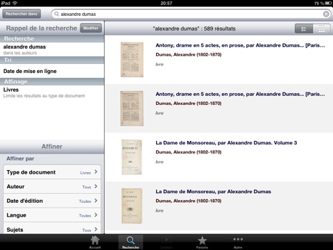Le moteur de recherche de cette application pour I PAD est en dessous de tout ! On a beau lui spécifier que lon ne veut consulter que des livres, il sobstine à présenter des cartes, des images, des périodique dans lesquels il est impossible, dailleurs, de trouver ce que lon cherche sans avoir à compulser des tonnes de pages sans rapport avec le sujet. Cest dautant plus décevant que le site sur ordinateur fonctionne à peu près correctement... vraiment nul !