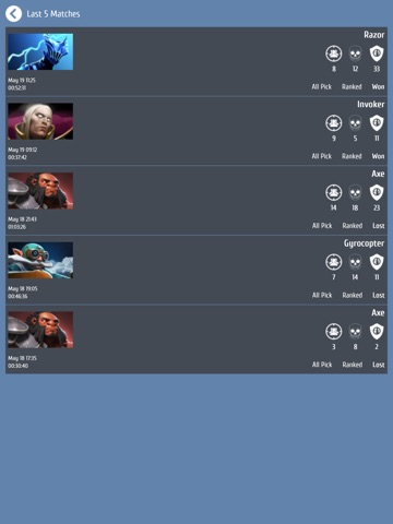This app is designed for all the Dota2 lovers who would like to view their stats onto their hand held devices instead of going to a website. This app gives you the just the information you need to be on top of your stats for the game or for other players if you know their Vanity Names.