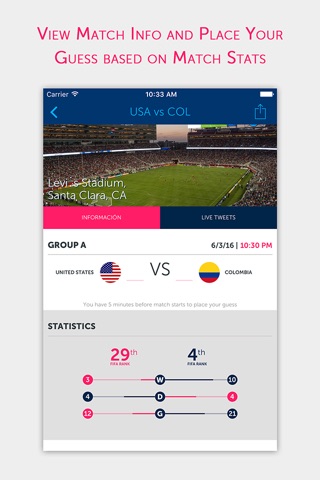Each match has past statistics so you can improve your guess and a live feed of tweets so you do not miss anything before, during and after the game.