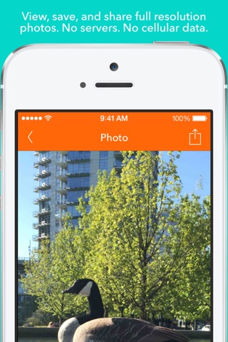 Gander does not send your photos to the cloud or Internet; photos are only shared directly with other users that are close to your device. Its fast, private and secure.