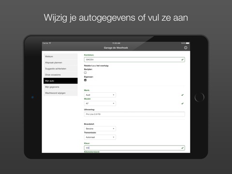 Met de Garage de Westhoek App kan je direct een werkplaatsreservering maken en je eigen auto- en persoonsgegevens beheren. Je persoonlijke inlogcode kan je aanvragen door ons te bellen of te mailen, vermeld hierbij je kenteken. Wij sturen per SMS je inlogcode!