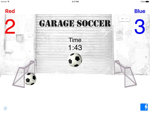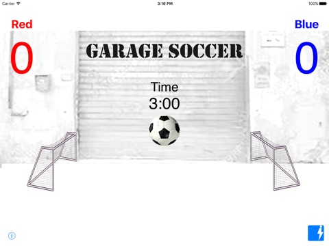 The garage Soccer iOS App provides an interactive scoreboard and timer for Superinteractives real world Garage Soccer game. To play, two teams of one or two players each choose a playing field approximately 3m long and place two goals (54cm x 31cm) at either end and must kick a ball (15cm diameter) to hit the goal to score. The Garage Soccer game is started by touching on Time and is played for 3 minutes at the end of which the team with the most goals is the winner. To add a goal, touch on the appropriate teams score. To reset the game touch on the Garage Soccer title. When used with Superinteractives Garage Soccer Equipment the App provides for automatic scoring with sound effects for goals and timer. The game can be paused by touching Time.