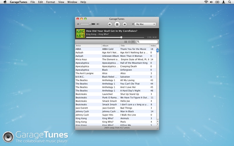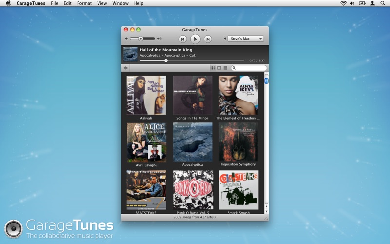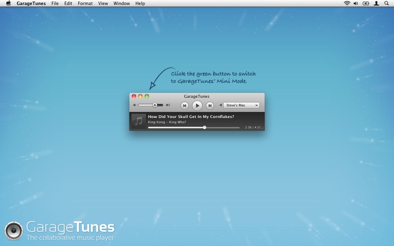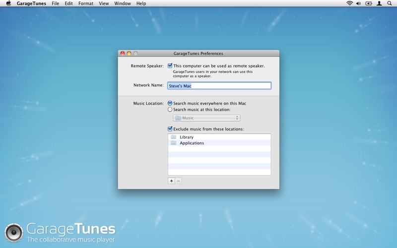 GarageTunes is ideal for listening to music at work or at home with your friends: It lets you listen to music files on any Mac running GarageTunes in your local network.
