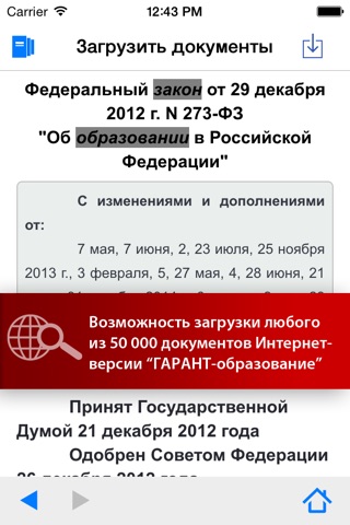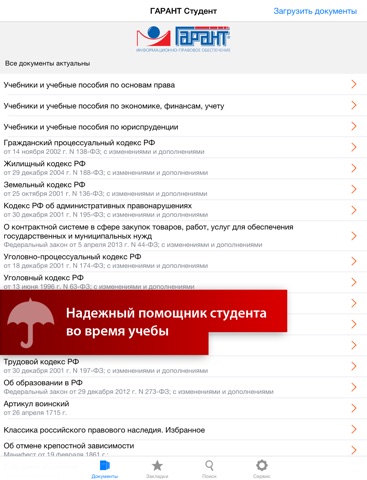Приложение от информационно-правового обеспечения "Гарант" содержит наиболее востребованные документы современного российского законодательства - Конституцию и все кодексы Российской Федерации. Именно к ним чаще всего обращаются учащиеся и преподаватели учебных заведений юридического и экономического профилей. "ГАРАНТ Студенту" - это полноценное приложение для устройств Apple, не требующее выхода в интернет для изучения правовой информации. При этом в случае необходимости, когда мобильное устройство подключено к Интернету, можно работать в режиме онлайн со специальным выпуском "ГАРАНТ-Студент", который содержит более 60000 нормативно-правовых документов, документы судебной практики, подборку статей из юридических журналов, издаваемых компанией "Гарант" и полную версию "Домашней правовой энциклопедии".Обновление приложения можно быстро загрузить, когда у Вас появится такая необходимость и будет доступ к Интернет.