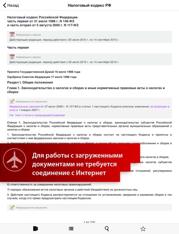 Кроме простого и эффективного Базового поиска, с помощью которого можно быстро найти ответы на интересующие вопросы, в приложении реализован удобный переход к нужной части документов с помощью оглавлений. Возможность ставить закладки позволяет в любой момент быстро обратиться к нужной статье.