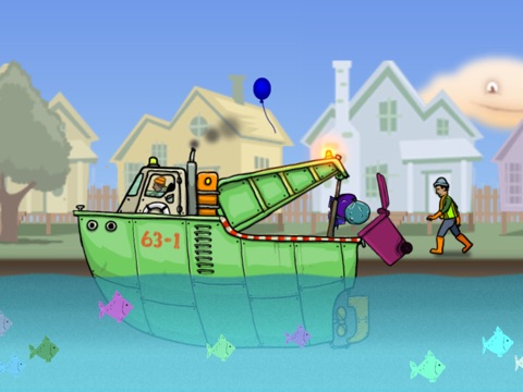 Ride along on a garbage boat on garbage day as it floats through a coastal neighborhood. Help the garbage man pick up the garbage cans. A real treat for those little garbage truck enthusiasts and a great way to encourage curiosity and interaction for all. Touch the driver and he honks the horn. Touch a cloud as it passes by and it smiles and hums. Touch the fish and they jump and splash! The neighborhood is interactive. When your child touches people, animals, or objects they make sounds and perform actions. Its like a moving story book!