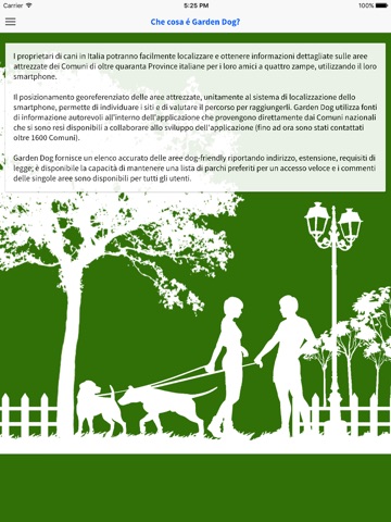 Il posizionamento georeferenziato delle aree attrezzate, unitamente al sistema di localizzazione delliPhone e delliPad, permette di individuare i siti e di valutare il percorso per raggiungerli. Garden Dog utilizza fonti di informazione autorevoli allinterno dellapplicazione che provengono direttamente dai Comuni nazionali che si sono resi disponibili a collaborare allo sviluppo dellapplicazione.
