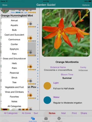 • 16 categories of plants... Annual, Aquatic, Bulbs, Cacti and Succulent, Carnivorous, Conifers, Epiphytic (including orchids), Ferns, Grass and Ground covers, Palms, Perennial, Shrubs, Trees, Vegetables and Fruits, Vines and Climbers, Favorites and Notes.