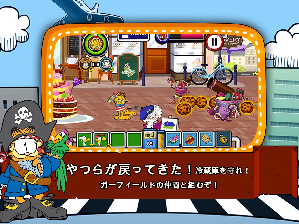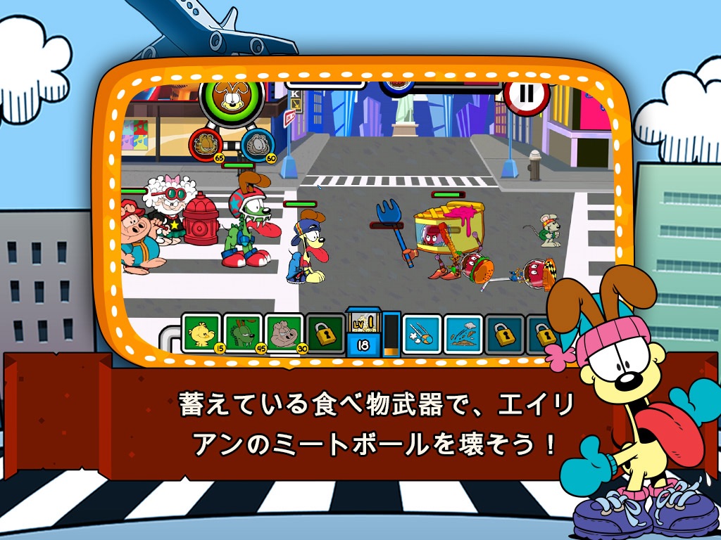 After getting crushed by Garfield and the rest of the Arbuckle household in the first awesome game, the Food Invaders withdrew to plan revenge on our little blue planet. The aliens abandoned their plans to capture Jon’s fridge, and now plot to take over all food, everywhere. It is a dark time, and the fate of our planet hangs by a thread. The aliens are descending on New York, Paris… even Santa Claus in his North Pole retreat is not safe!