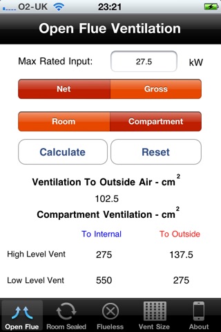 This application will help calculator ventilation requirements for Open Flue appliances, Room Sealed appliances and Flueless appliances.