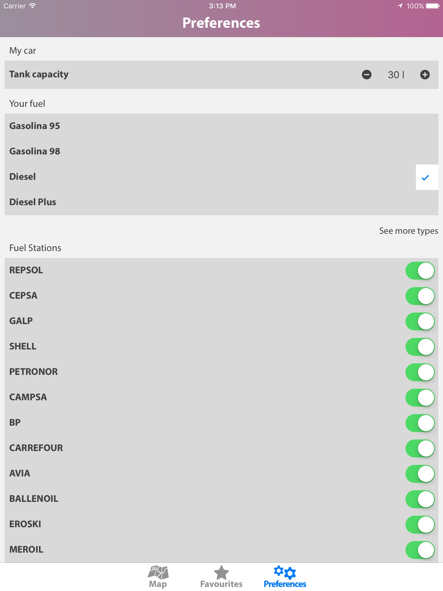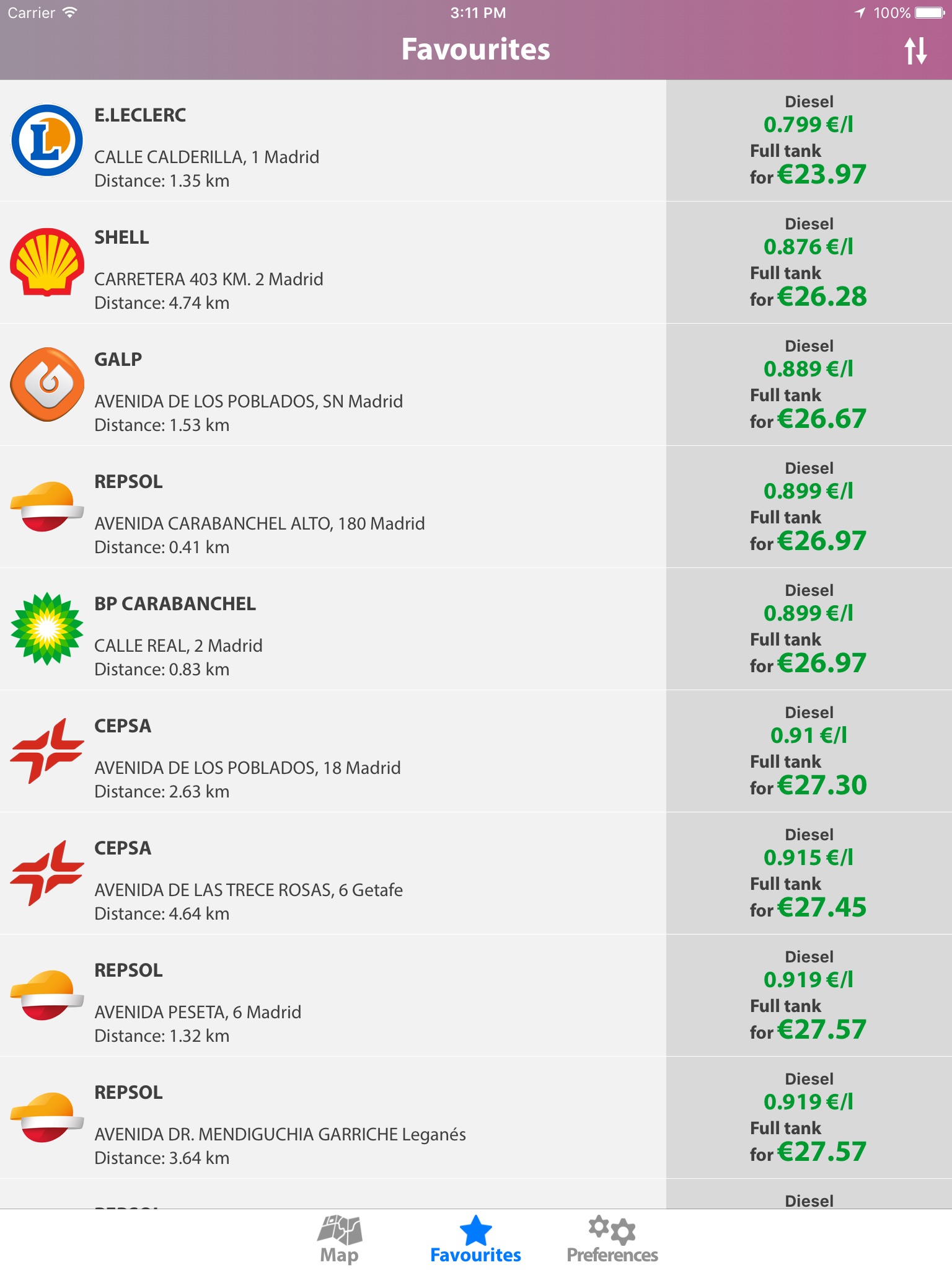 You can setup a custom list with your favourites gas stations to know their fuel prices and distance from your location.