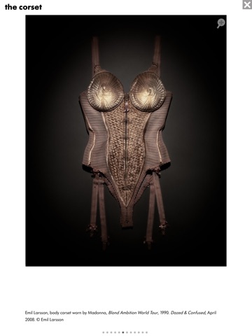 • exploration of key themes from the exhibition, with stunning photographs of Gaultier’s most iconic pieces, including Madonna’s conical bra and corset