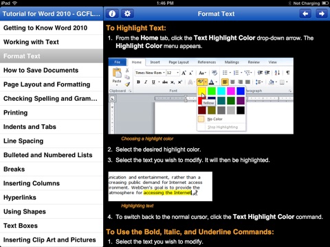 Based on the popular tutorials available at GCFLearnFree.org, Word 2010 Tutor App guides the learner through the updates of Microsoft Word 2010. The application explores program basics and common tasks and delves even deeper to work with more complex features. Instructional step-by-step text is accompanied by graphics and over 25 videos.