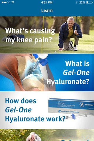 The Gel-One Patient App is a resource for people experiencing knee pain. It contains valuable information about the causes of knee pain and a safe and simple non-surgical treatment option, Gel-One® Hyaluronate.